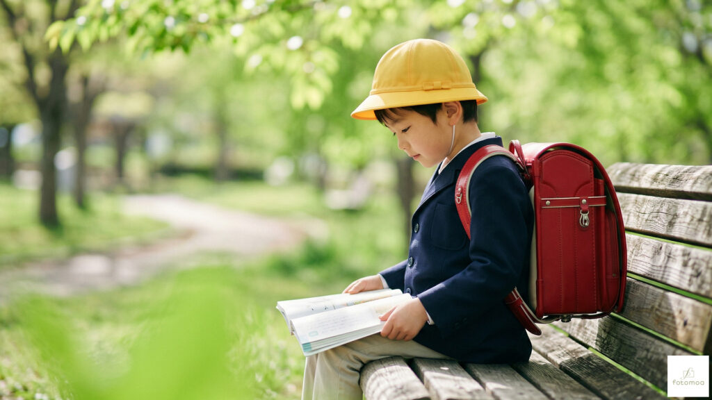 ・教科書・文房具・通学帽子など、入学後に揃うアイテムと一緒に撮影できる